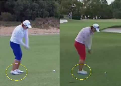 切返しで右踵が上がらないように両手で踵を押さえてみました。