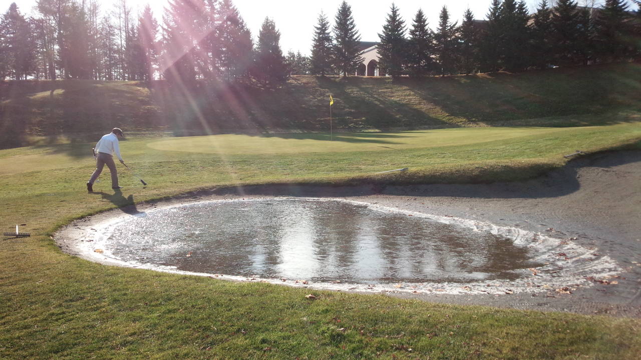 バンカー内の水溜りが凍っていました。日陰のグリーンも凍っています。
