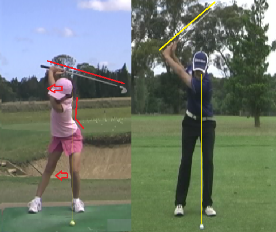バックスイング時腰が回りやすく頭が右へ動き、トップがオーバースイングになる。