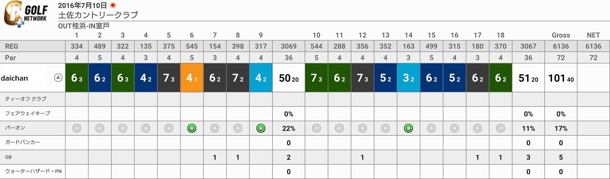 なんだか覚えてませんが4オンするも3パットでダボ発進のようです(笑
