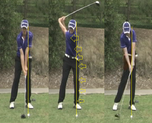 バックスイングからトップにかけて左太腿から左足裏まで右へ