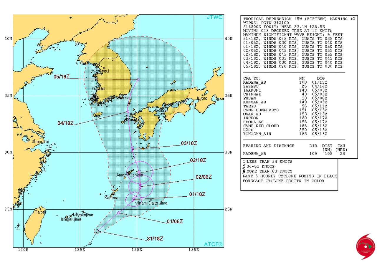 はい、いつもの米海軍の進路予想であります、時差がありますので12時間ほど引いて見て下さい