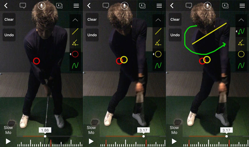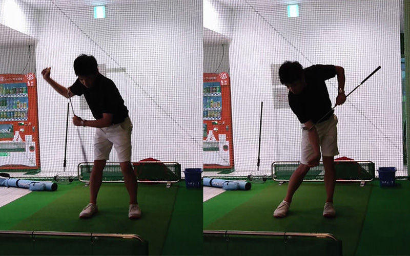 今回のレッスンは右肘の位置に注目したレッスン。正面からの画像で、がアドレス時よりインパクトで右肘が飛球線方向にあるように、という内容。