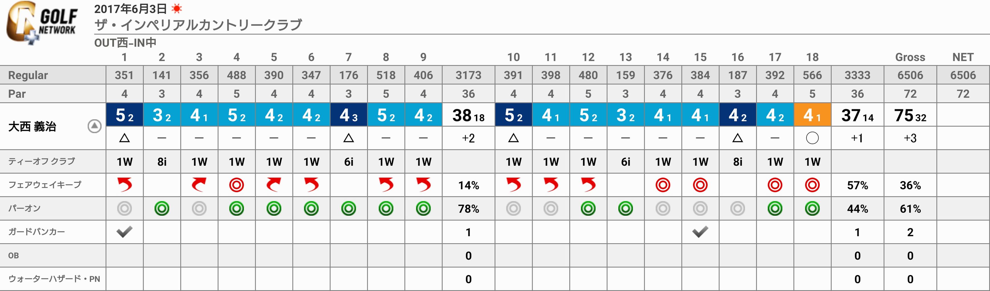 荒れたグリーンで2mほどのバーディーパットを2度外しましたが、幸運なキックに助けられたショットも2回ほどあったので、差し引きゼロかな。