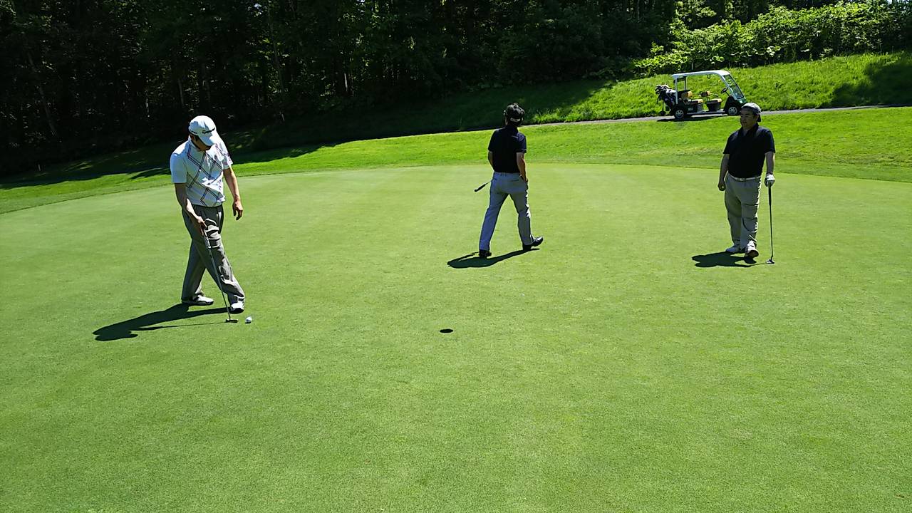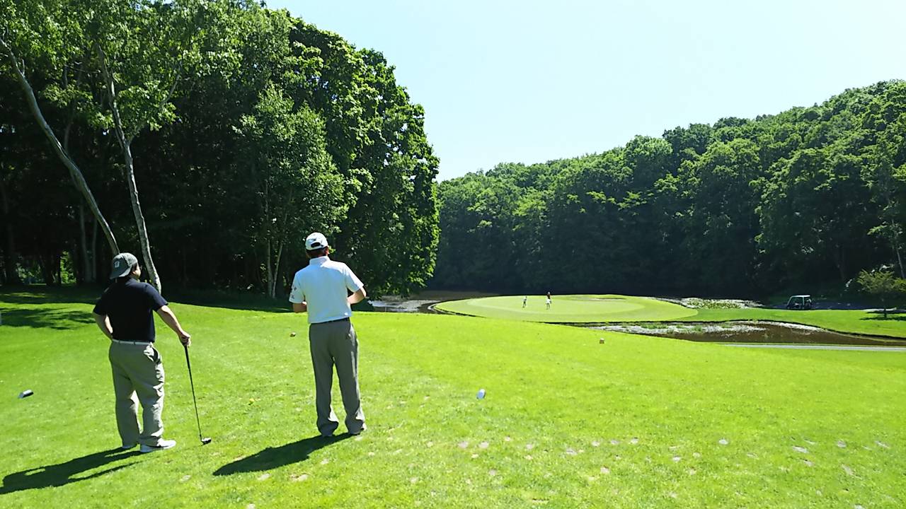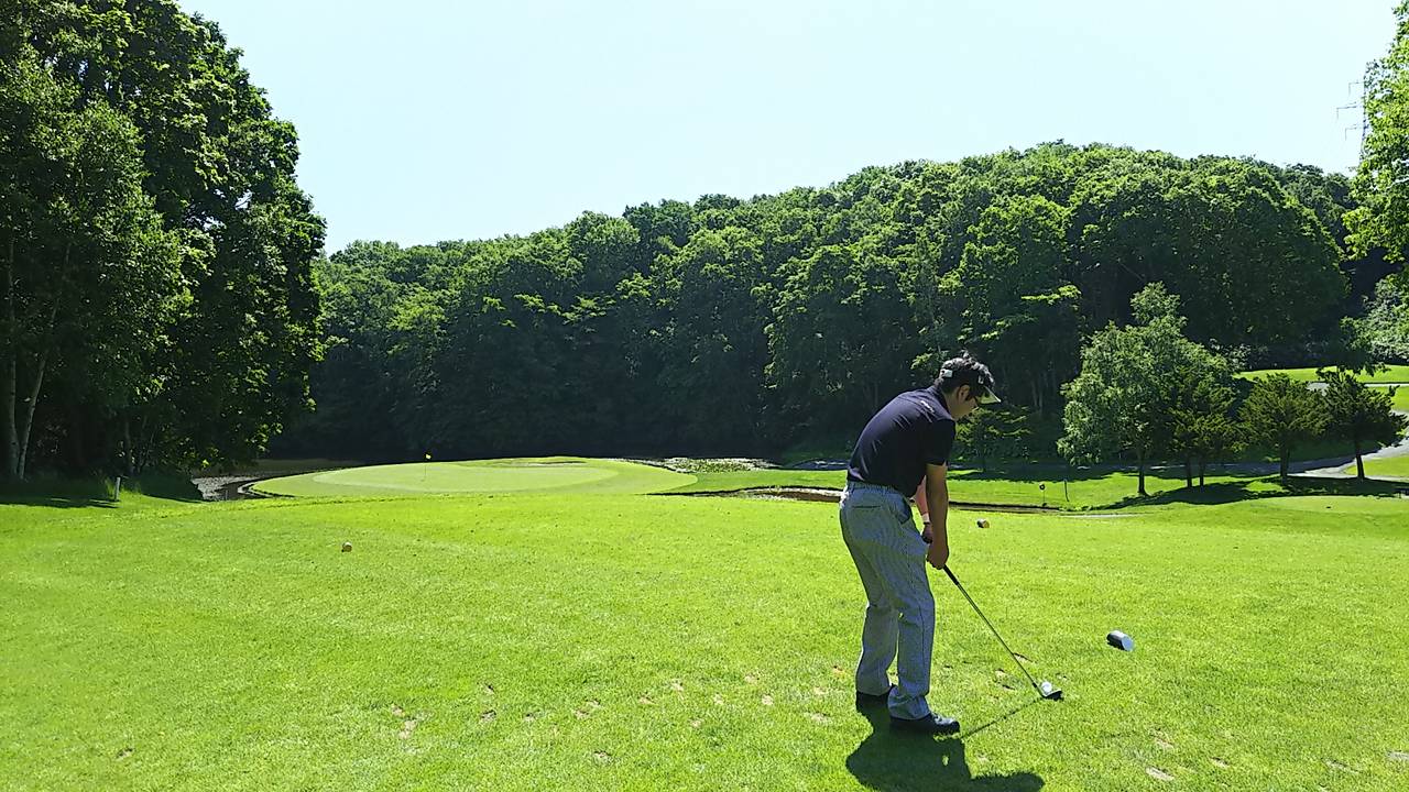 4打目は残り150ヤードの下りの池越えで6鉄で