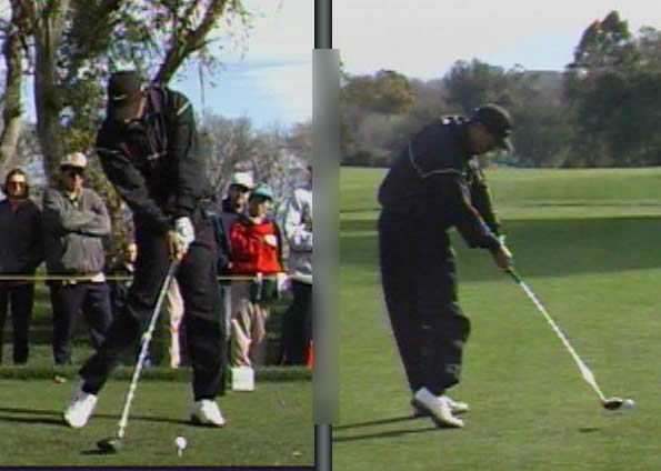 というわけで、上の図がインパクト前後の変化ですが、わかりやすい変化は左ひざの動きの変化で、22歳の頃のスイングでは左ひざを突っ張ってスイングしていることがわかるでしょう。左足踵の動きに注目してもらえれば、以前は浮き上がっていなかった踵が、浮き上がっていることからも、かなり強烈に膝をつっぱり切ってスイングしていることがわかります。この動きによって左ひざの致命的な怪我を生むことになったことは明白です。タイガーとしては、損害賠償を請求してもいいくらいかもしれないですよね?