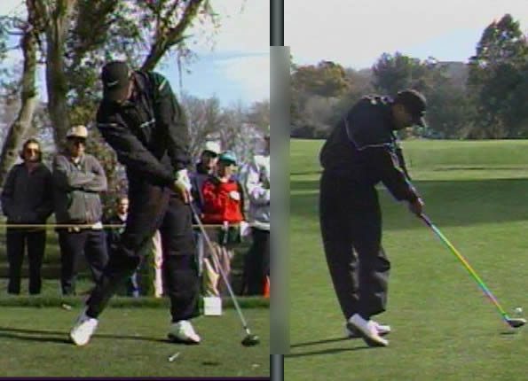 ローテーションを抑えた22歳の頃のタイガーは、左肘がチキンになる悩みが発生していました。そもそもはそんなことがなかったのにフックグリップにしてローテーションを抑えたがためにそうなったのです。上のフォローでもチキンが発生しそうになっていることが感じられると思いますが、この頃はそれがなければ真っ直ぐ打てないスイングだったということになります。