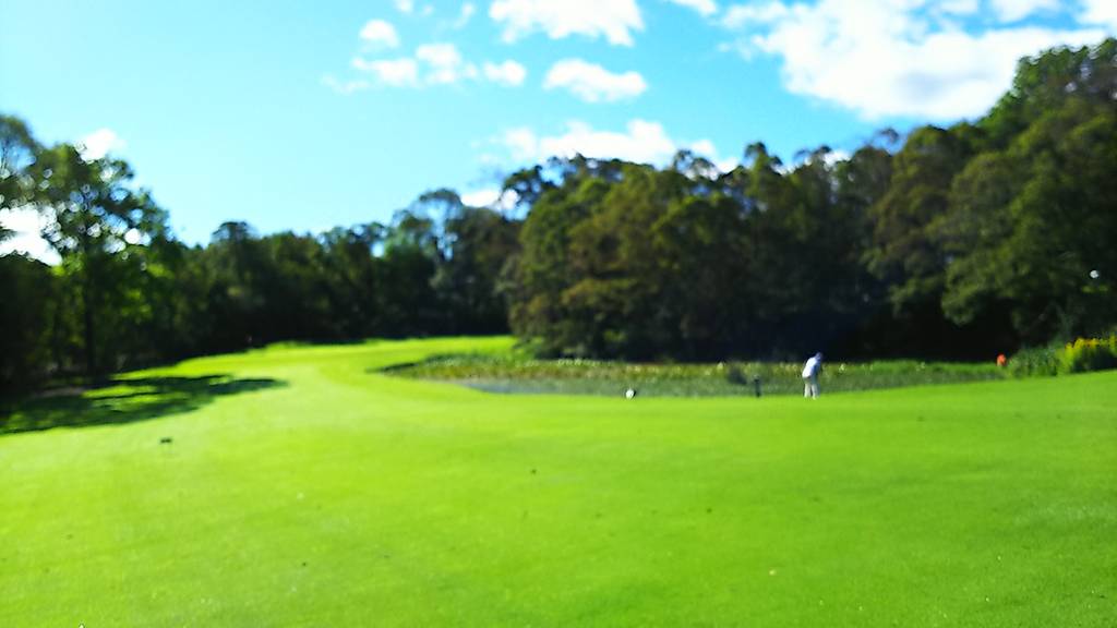 若干下りで距離感が掴みにくいですが、レギュラーティーが113yardですと通常ならばAWかPWで十分届くと思います。レディースティーはもう少し短い距離になりますが、池越えには変わりなく簡単ではないです。