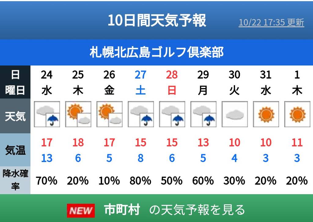 先週末は道内では今季最後のゴルフ日和のような好天に恵まれましたが、そんな時に限ってラウンドが無く、今週末(土)に開催される我らがNGBコンペの天候が心配になって来ました…(^_^;)