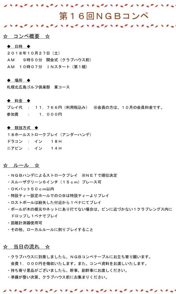 約1名はコンペ直前にならないと参加出来るかどうか分からないと言う状況ですが、欠けたら欠けたで仕方ありません。今までのNGBコンペの最小人数が8名ですから記録更新となるかも知れません…(^_^;)