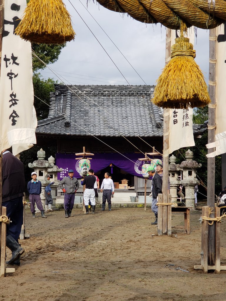 神社内は、平均年寄りと女性が担当して、のぼり立てを行うが、