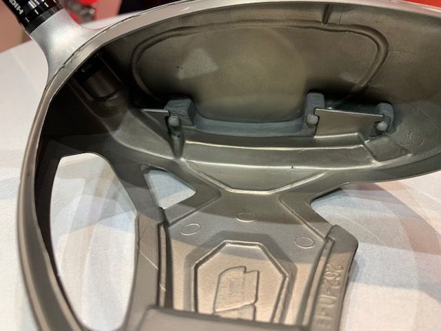 いったんルールを超えたヘッドを作った後に、このフェース下部の2つのポケットにレジンを注入してルール内に収めるんです。これは1つ1つのヘッドを計測して注入していくので全てが同じ注入量ではないということです。 これは僕の勝手な想像ですが今後スーパーツアースパイシーとか出てくるのかななんて思ってしまいます。