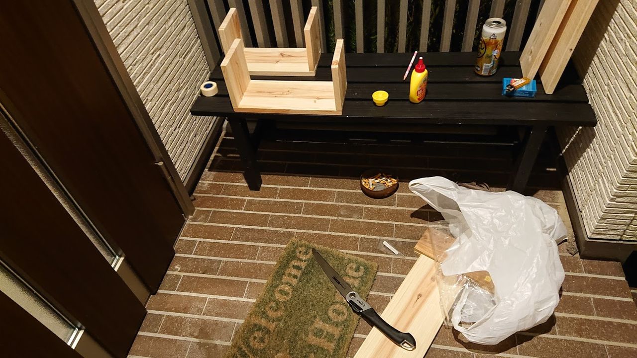 玄関先で夜中にのこぎりを引くシュールな状況、コの字型の台を作ってくれと頼まれたのと