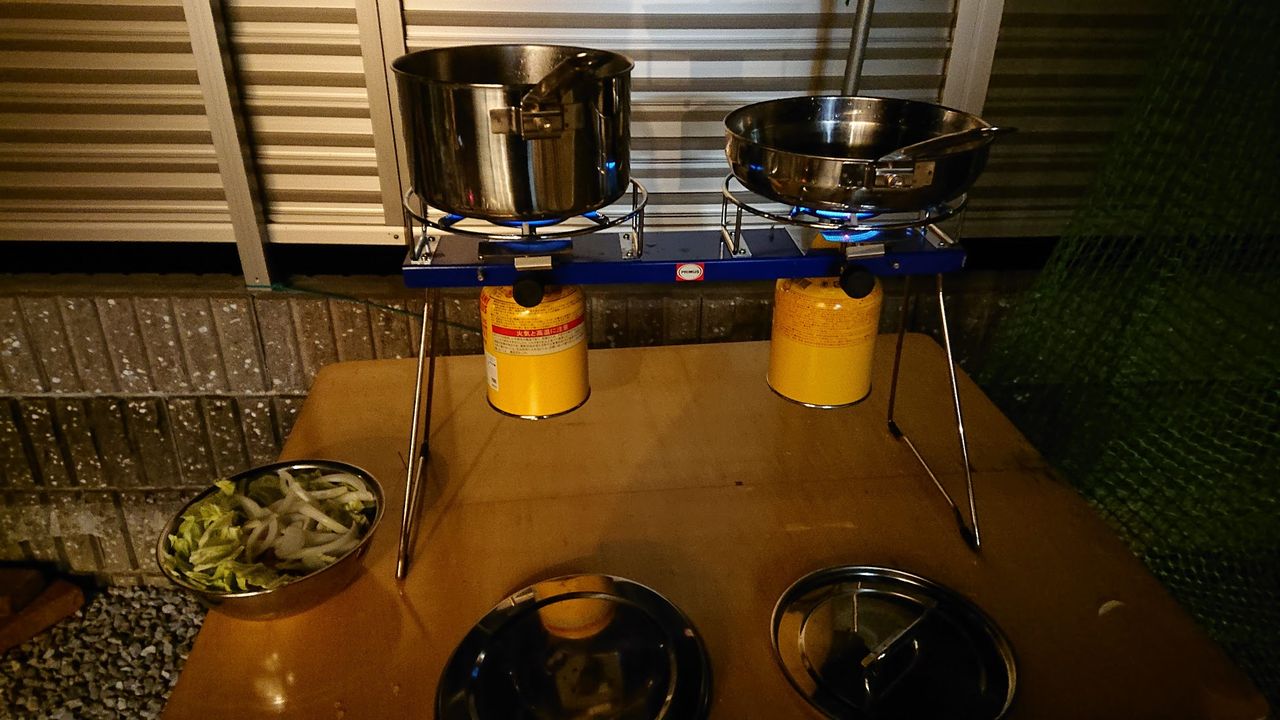 そして嫁所有の古いプリムスの2バーナーとキャプスタの食器セットを使用し