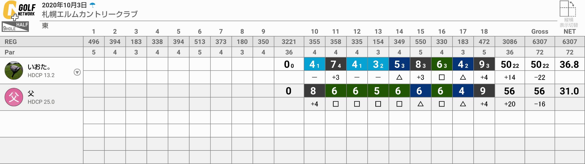 雨が強く降らなければ最後まで参加出来たと思いますが、年輩の同伴者の方が強い咳をされていたのも気になり今回は途中で止めさせて頂きました。父とは今後また北広島でのんびりとゴルフを楽しんで行きたいと思います。