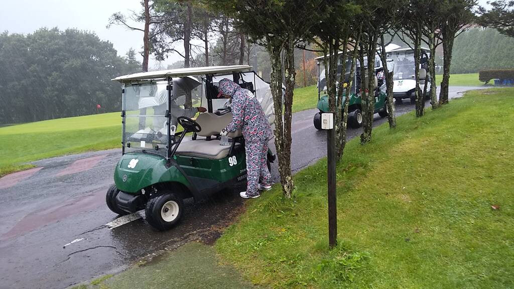 今回は父の関係のコンペに親子で参加させて頂きましたが、開始早々の大雨でプレーはままならずスコアは散々…父は一応カッパは着ていましたが帽子が雨天用ではなかったので風邪を引かないよう大事を取ってハーフで棄権する事に…。