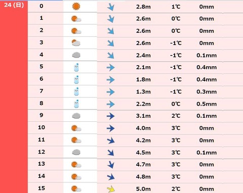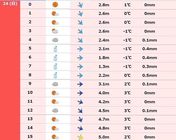 朝8時まで雪マーク&日中3度で風速5Ⅿ