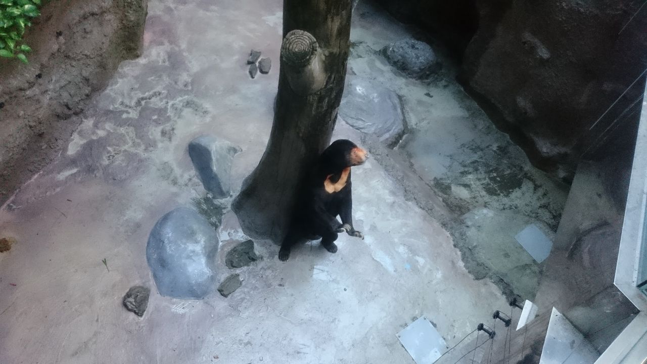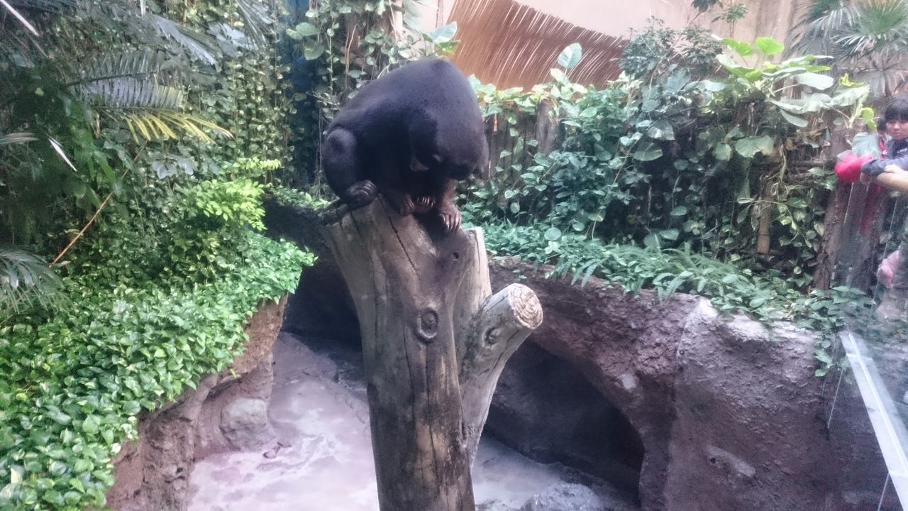 しばらく進んでいきますと、ジャンルゾーンという熱帯気候の動物達がいる室内展示でマレー熊のジュースタイムが