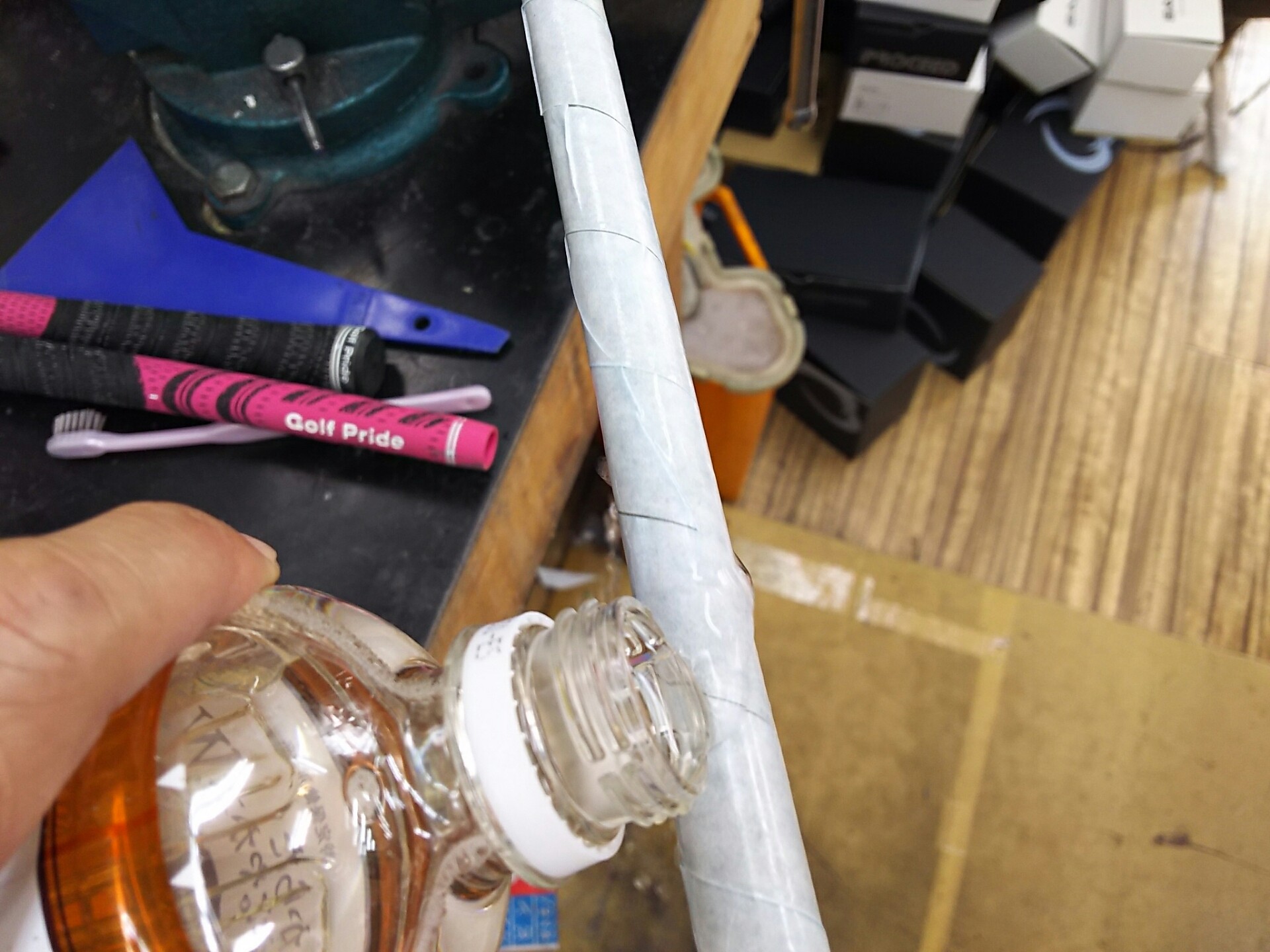 このように、シャフトにテープを巻いた後水をジョボジョボとかけて、暫し水分を馴染ませた後、スーッとグリップを入れてあげるだけ