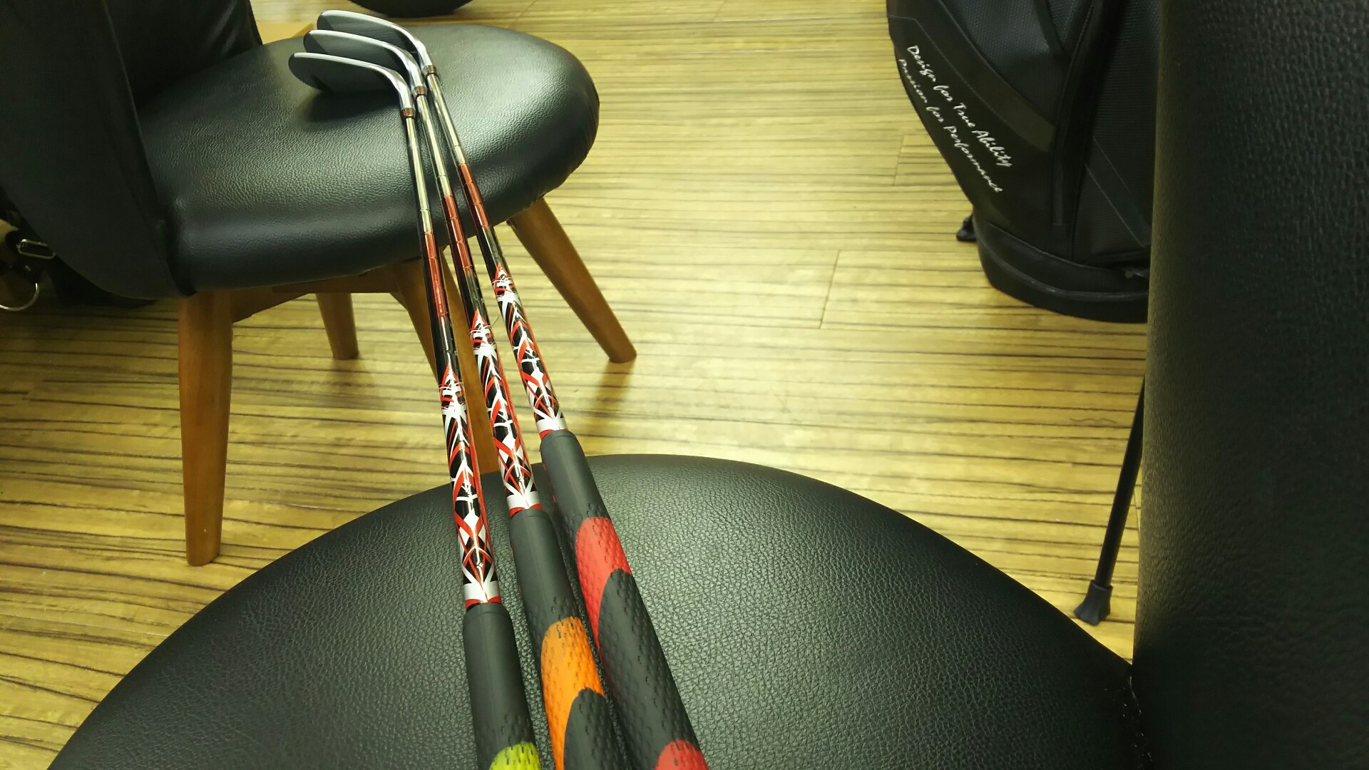 グリップはグリーン回りでバタバタしないようにと、48.53.57とM様の使い方や打ちたい隙間を埋めるべくチョイスした3本の上からイエロー・オレンジ・レッドと濃くなって
