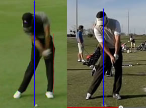 左軸か右軸かという違いの結果、上の図ではもう一つ重要な変化が出ている、ということでしたが、それが何か考えて頂けたでしょうか?それは、軸の位置が違うのだからどうしてもそうなってしまう、ということなのですが、例えば左足の角度の違いというのもその一つと言えるでしょう。タイガーの左足は左に傾いているのに対し、ショーンのは右に傾いています。(向かってです。)それと似た違いなんですが、一体どんな重要な違いがあるのか?考えてみてください。それではここでCMです・・・