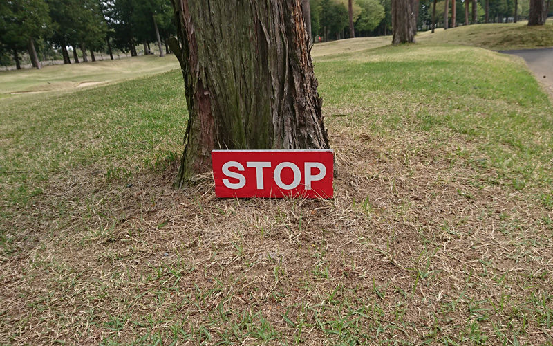左足下がりで7番アイアンでしたが、ボールのはるか手前をダフって空振り。よくやる悪いクセが出たわけですけど、ボールに当たらないとは・・・恥ずかしい。