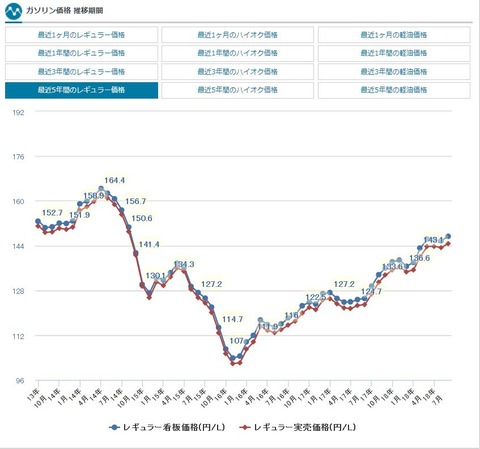 過去5年のレギュラーガソリンの価格推移を見てみますと