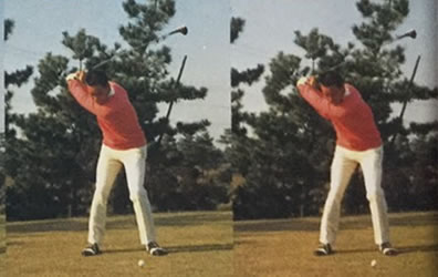 さて、上の図は左がトップ、右がダウン開始のあたりです。下半身の動きの違いでダウン開始がわかると思います。それではここでクエスチョンです。上の図では、青木プロが後に修正した重要なポイントがあるのですが、それはどこでしょう?スイング不思議発見!
