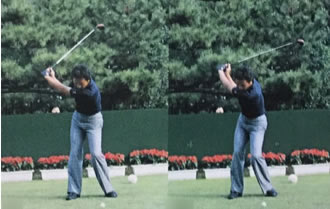 71年のスイングではシャットでした。そして、下の図は77年ですが、この頃もまだ82年ほどは開けていなかったことがわかります。なので77年はゴルフに開眼した後ですが、まだスイングは完全ではなかったと思われます。しかし、78年には自信を持てたということなので、ここから急速に良くなったのでしょう。