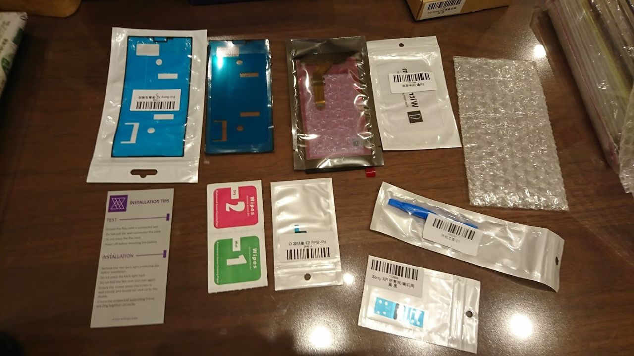 真ん中のピンクのプチプチがディスプレイ本体、その右横は隙間に突っ込む薄い板、右下の青い棒も
