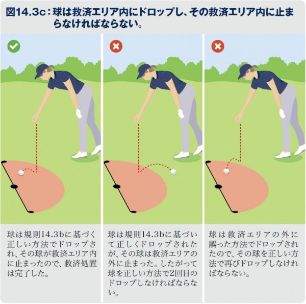 規則:14.3c 正しい方法でドロップした球は救済エリアに