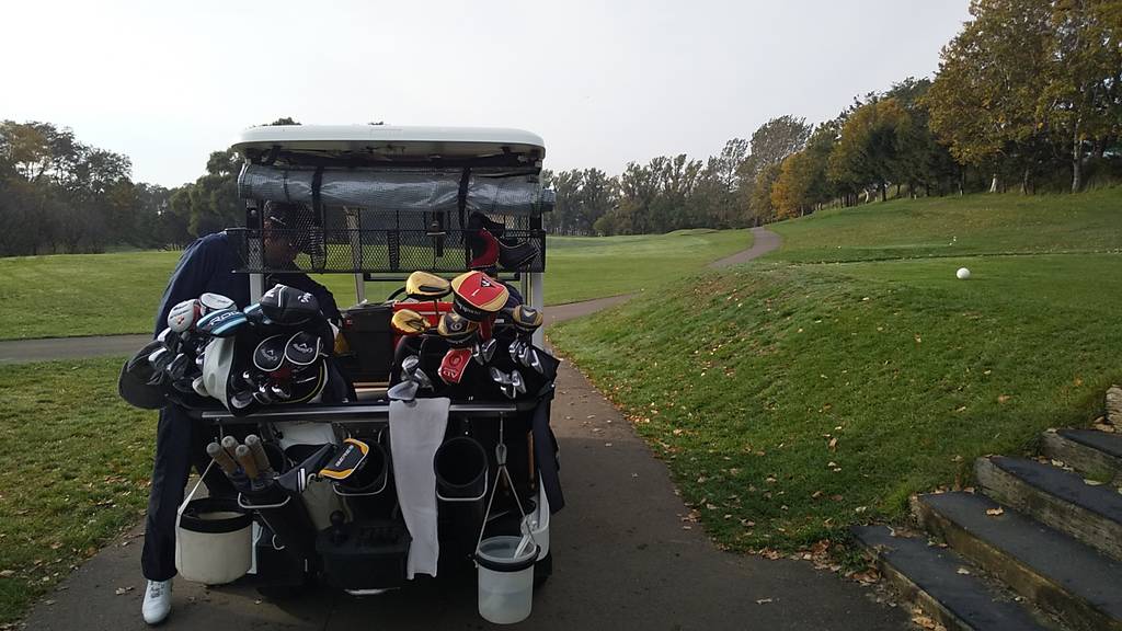 8時半頃のスタートでコース到着時はまだ肌寒い気温でしたがクラブハウス内はコンペ等で賑わっていました。此処は駐車場の奥にネットを張ったレンジがあり、バンカー練習も可能ですが今まで殆んど練習した事は有りません。