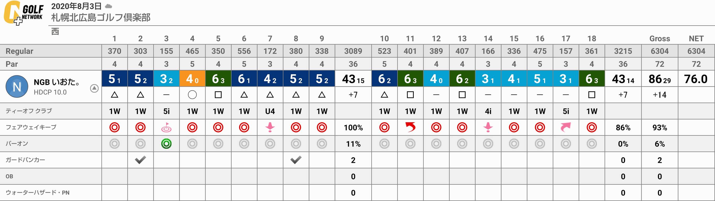 その後は後半にもチップインがあり、今回は52度のAWでの転がしアプローチが上手く行く事が多かったですね。パットもピン型に換えてから良くなり、14~17番は全て1パットの連続パーとして後半も43の86をマーク!今季8R目でようやく80台を出せました。