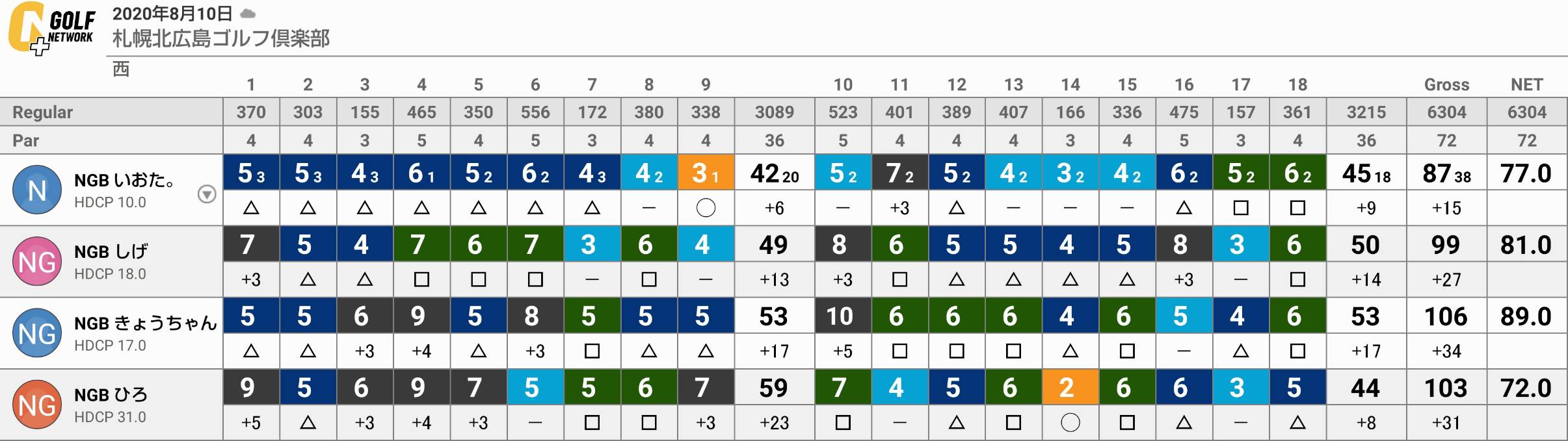 前日にもラウンドされたしげさん以外は久々のゴルフと言う事で勘を取り戻すのに若干苦労されていた様子…しかし調子が出てくると飛ばし屋のひろさん、きょうちゃんはドライバーで大いにかっ飛ばされていました。特にひろさんは当たるとヒカルさん級の飛びでしたね。