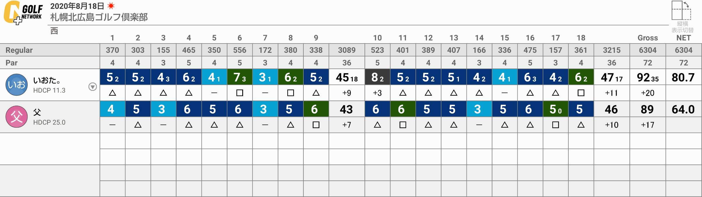 お盆が過ぎ、今回も父とのツーサムへ。私は今季10ラウンド目、父は6ラウンド目…父とのラウンドは殆どが西コースと言うのもあり、今まで北広島には来た事の無い父も大体コースを覚えてきたようです。