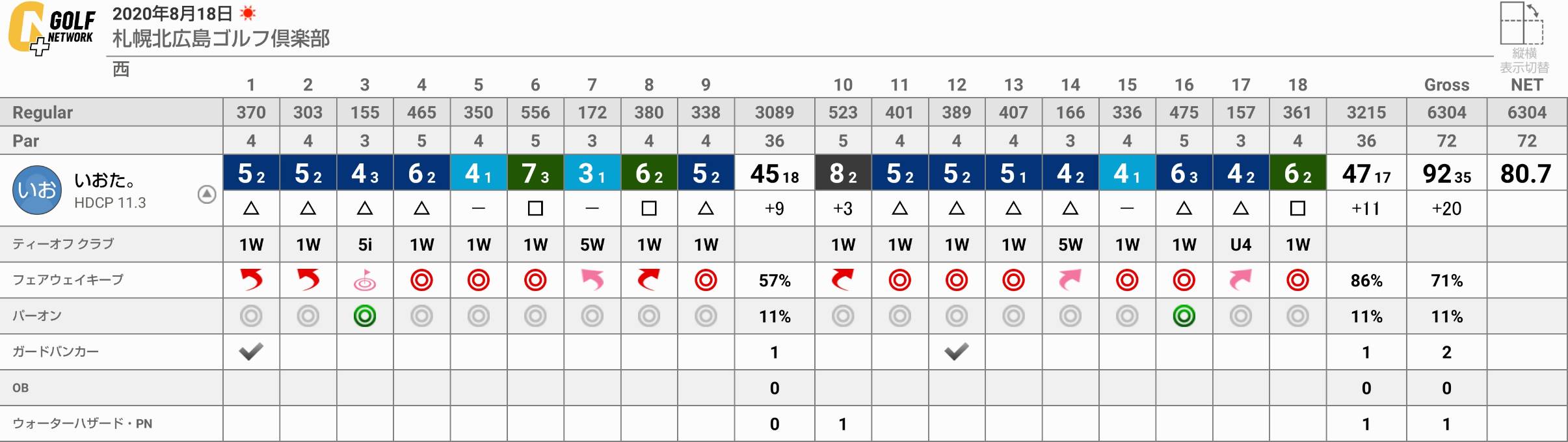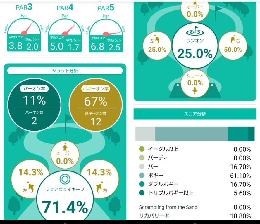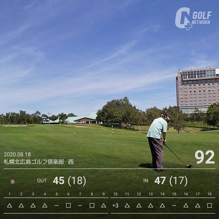 【いおた。memo】今回は左肘にサポーターを巻いたせいかラウンド後の肘の痛みはそれ程でもなかった。打ち方もインパクトで叩くような事はしなかった。またパットがイマイチだったがパターのスタンスは狭い方が良さそう。短いアプローチはボディターンで上手く打てた。
