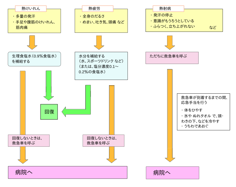 少しでも変だと思ったら、水分と塩分を補給し、涼しい場所に移動して